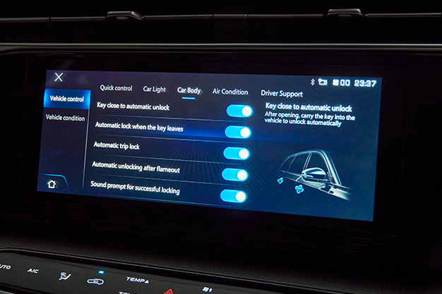 If the key is near the Oshan X7, it greets you by opening the side view mirrors, breathing headlights and unlocks the doors to give you a pleasant welcome.